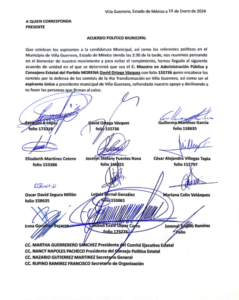 En el documento signado por Ezequiel X López, Guillermo Martínez García, Elizabeth Martínez Cotero, Jocelyn Stefany Fuentes Nava, Cesar Alejandro Villegas Tapia, Oscar David Segura Millán, Leticia Bernal González, Mariana Colín Velázquez, Irma González Becerra, Alexis López Carro, así como Juvenal Trujillo Ramírez, no solo manifiestan su respaldo, si no que también declinan en favor de David Ortega.