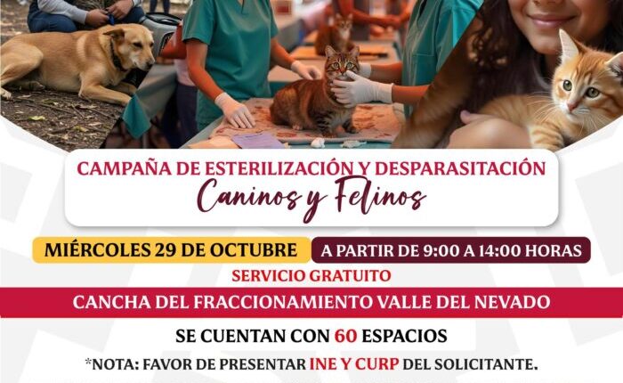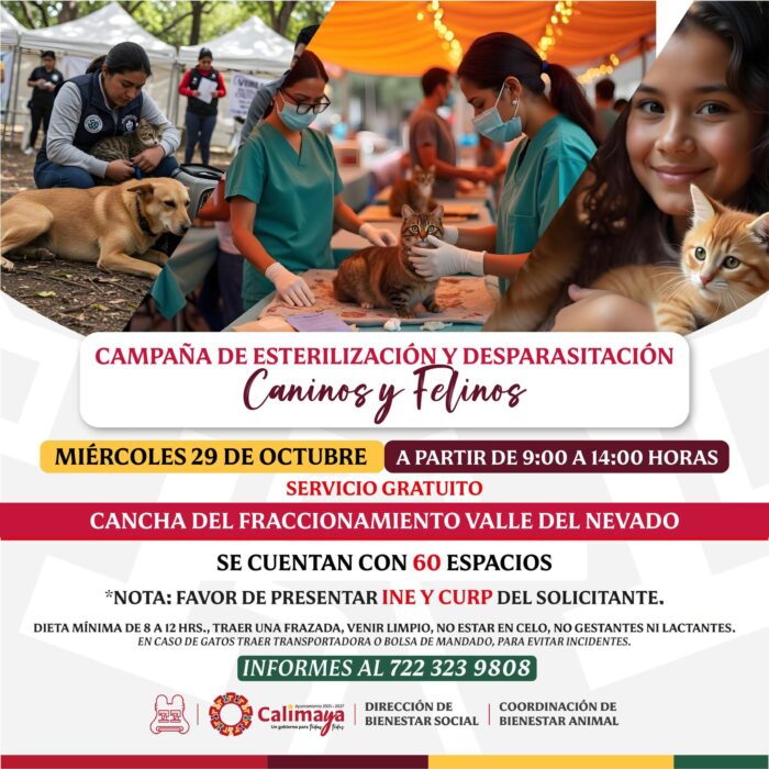 Calimaya, Estado de México, 26 de octubre de 2025.— La comunidad de Valle del Nevado será la sede de una Jornada de Esterilización Canina y Felina el próximo miércoles 29 de octubre. La iniciativa es resultado de la colaboración entre el Gobierno Municipal de Calimaya y el Instituto de Salud del Estado de México (ISEM), buscando fomentar el control responsable de la población animal en la zona.
