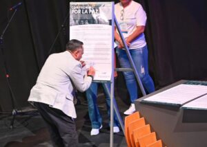 Huixquilucan, Estado de México a 21 de mayo del 2024.- En las instalaciones de la Universidad Anáhuac y frente a representantes de la comunidad Católica del Estado de México, Javier Rivera Escalona, Secretario General del Partido de la Revolución Democrática en el Estado de México, suscribió a nombre del PRD, la firma de 38 propuestas en el documento denominado “Compromisos por la Paz» organizado por el Episcopado Mexicano, el cual tiene entre sus prioridades promover acciones y políticas públicas en favor de la no violencia.