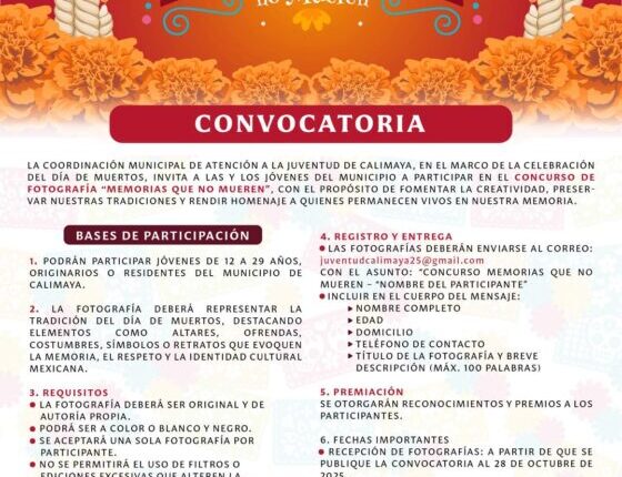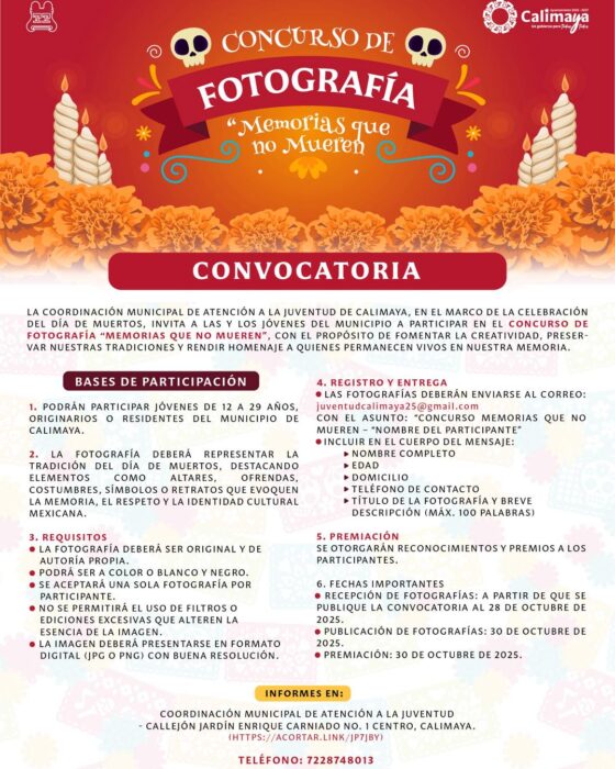 Calimaya, Estado de México, 18 de octubre de 2025.— La Coordinación Municipal de Atención a la Juventud de Calimaya, en el marco de la celebración del Día de Muertos, ha lanzado la invitación al Concurso de Fotografía “Memorias que no Mueren”. El certamen está dirigido a las y los jóvenes de 12 a 29 años, residentes u originarios del municipio.