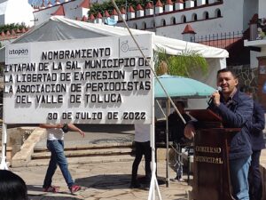 Durante el evento, el alcalde Edgar Ocampo junto con Sergio Villafuerte presidente de la Asociación de Periodistas del Valle Toluca, develaron la placa de Libertad de Expresión.